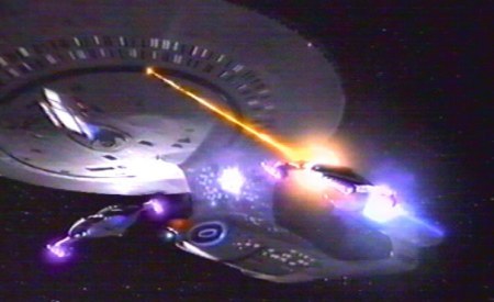 - Bald entdeckte man Siskos Runabout, die vier Vermißten wurden auf die Rio Grande gebeamt. Währenddessen wurden die Odyssey und die beiden restlichen Runabouts in einen Kampf mit drei Jem'Hadar-Kampfschiffen verwickelt. Die Schilde des Galaxy-Schiffes boten keinen zuverlässigen Schutz gegen die Polaron-Strahlen der Jem'Hadar, es kam zu Beschädigungen auf mehreren Decks, die Backbord-Warpgondel mußte wegen eines Plasmalecks abgeschaltet werden.
